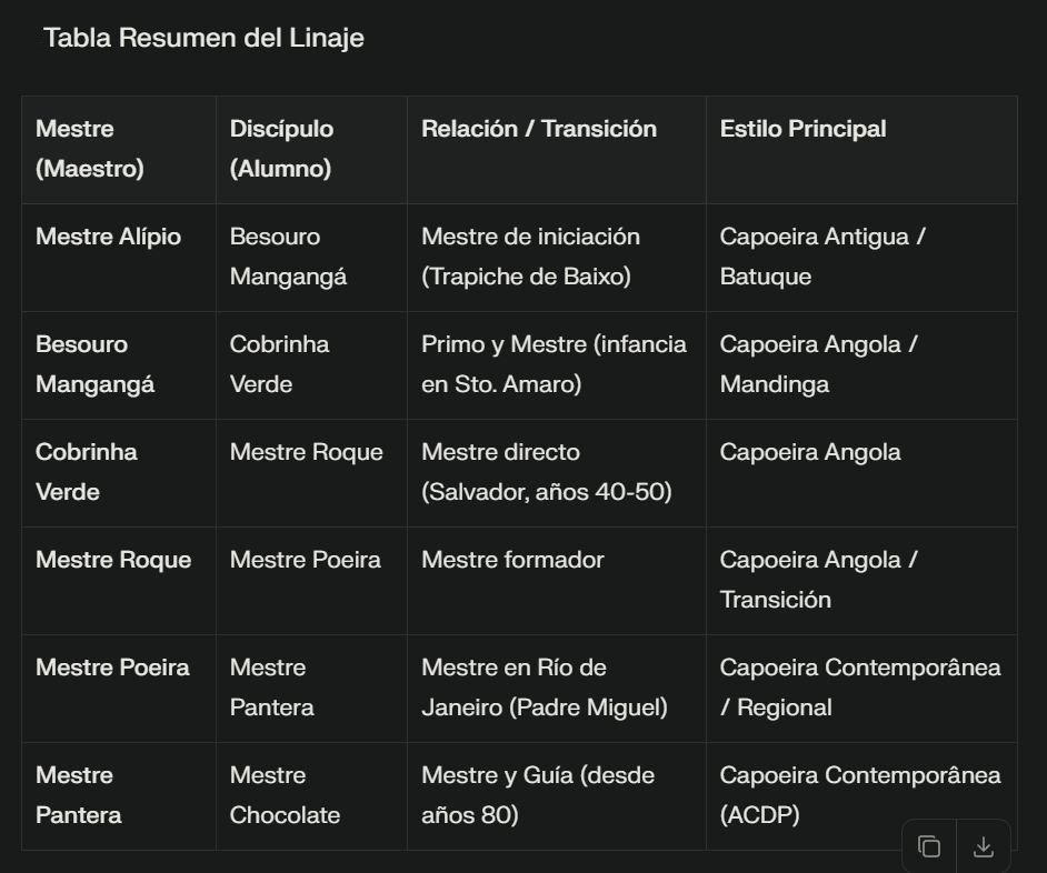 La genealogía presentada conecta la Capoeira Angola tradicional de Santo Amaro da Purificação (Bahia) con la expansión contemporánea en Río de Janeiro y su posterior internacionalización en Europa (España).